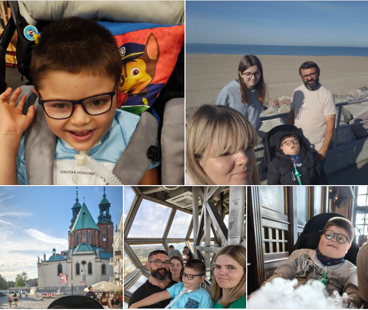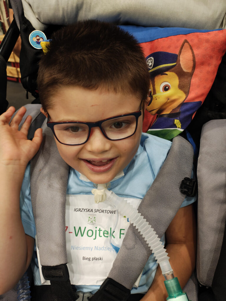 Wojtek to 8 letni chłopiec, który pomimo swojej choroby stara się cieszyć życiem tak jak umie. Choroby z którymi każdego dnia toczy nierówną walkę to: padaczka lekooporna opóźniająca rozwój, wada genetyczna, wrodzona wada części mózgu, niewydolność oddechowa spowodowana przebytym covid-19, wskutek czego ma tracheotomię i jest podłączony do respiratora 24h/dobę. Wojtek pomimo tego uczęszcza do ośrodka rehabilitacyjno – edukacyjno-wychowawczego Emedea w Poznaniu. W wolnych chwilach od zajęć, rehabilitacji i regularnych pobytów w szpitalu, Wojtuś uwielbia spędzać czas na świeżym powietrzu, różnego rodzaju imprezach, koncertach. Staramy się w miarę możliwości chodzić jak najwięcej na spacery, uczestniczyć w różnych eventach również, a może przede wszystkim w tych, na których obecna jest FNN (Ekiden, Bieg Motyli). Razem całą rodziną od kiedy jesteśmy w fundacji staramy się jak możemy wspierać zbiórki przed półmaratonem i maratonem Poznańskim – to już stałe pozycje w naszym kalendarzu. Staramy się jeździć z naszymi dziećmi po kraju i zwiedzać. Co prawda każdy taki wyjazd jest dla nas niemałym wyzwaniem. Zaplanowanie wszystkiego i zgranie czasowe jest bardzo trudne. Wszystko to jest uzależnione oczywiście od stanu Wojtka, ale też od pogody. Wojtek jest naszym małym wielkim wojownikiem, który każdego dnia pokazuje nam swoją siłę, determinację i chęć życia. Jego uśmiech i radość życia dodaje nam sił do dalszej walki, pomimo coraz to nowych przeszkód. Jesteśmy wdzięczni Fundacji za przyjęcie Wojtka pod swoje skrzydła, ale nie tylko za to. Dziękujemy też za ciepłe przyjęcie i umożliwienie nam uczestnictwa w zbiórkach jako wolontariusze.